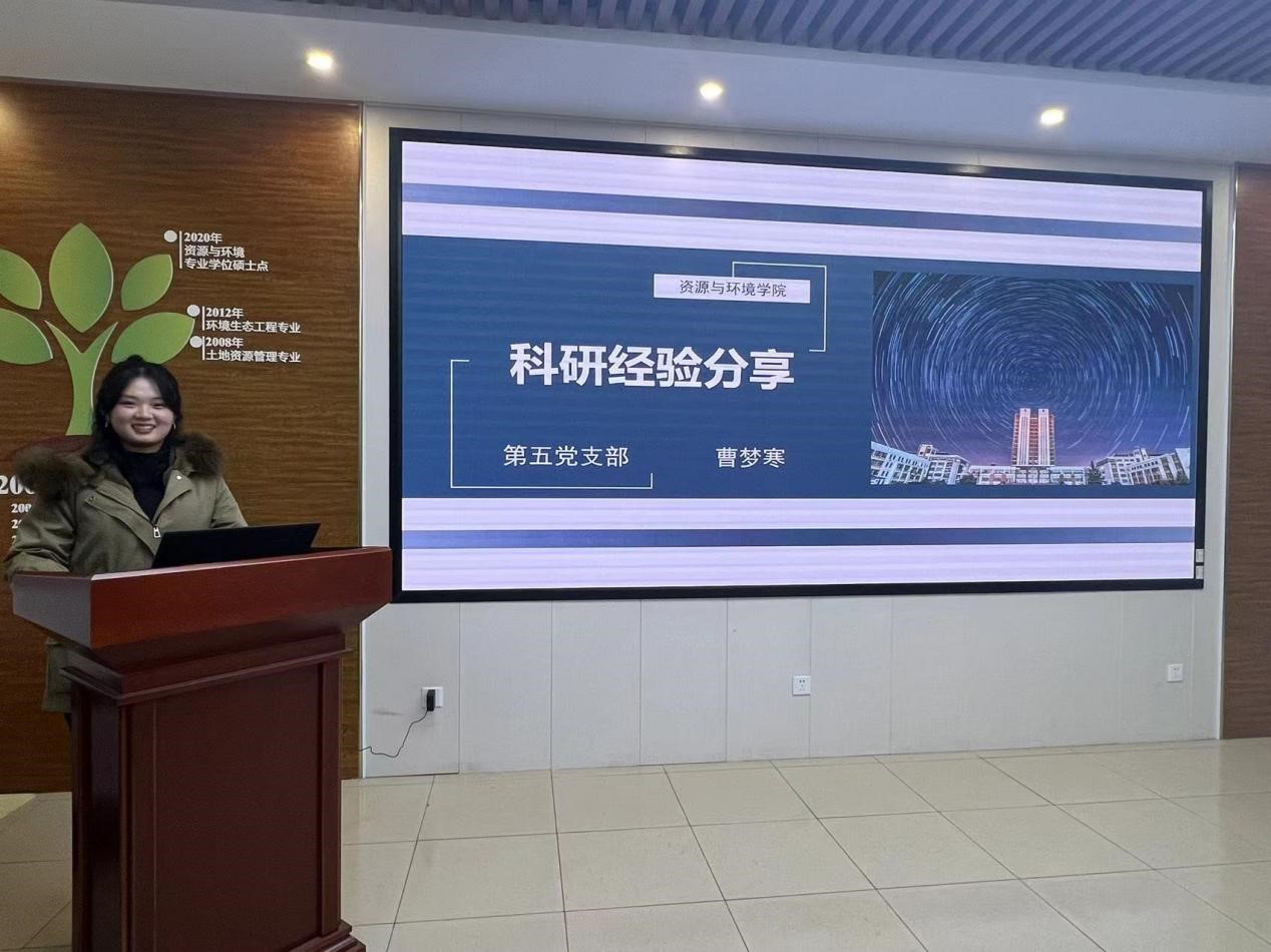 许淑妮以“党建引领促科研 ”为主题,从思想提升、科研学习、科技小院工作、志愿服务四个方面分享了她努力成为一名新时代农科学子的历程。从驻扎科技小院后懂民之苦,民之忧,再到认真学习获得各种奖励、发表科研论文,坚定理想信念,厚植“三农情怀”,她勉励大家奋发图强,用实际行动践行知农爱农的初心使命。曹梦寒从文献应如何阅读和整理、科研试验应怎样开展、论文应如何写作以及投稿注意事项三个方面展开经验分享。她详细的讲述了作为一名跨专业的研究生,从零基础到确定研究方向,从试验数次失败到最终成功,从不知什么是文献到成功以第一作者身份成功在期刊Chemical Engineering Journal(IF=15.1)上发综述论文的心得体会。她号召与会党员,在科研中要耐得住性子,多读文献、早开展试验、多与导师交流,不断积累科研成果。