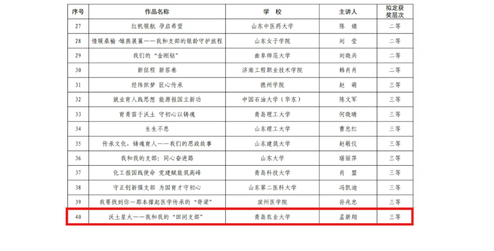 12月4日,山东省委教育工委公布了2025年度全省高校“党课开讲啦”“我和我的支部”获奖作品名单,公司第六党支部作品《沃土星火——我和我的“田间支部”》,凭借其鲜明的党建特色、生动的实践叙事和扎根一线的担当,在“我和我的支部”评选中荣获三等奖。