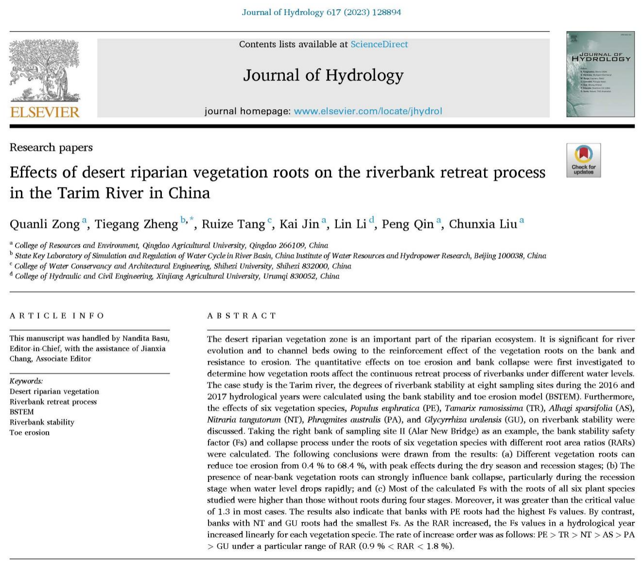 1. Quanli Zong, Tiegang Zheng, Ruize Tang, Kai Jin, Lin Li, Peng Qin, Chunxia Liu. Effects of desert riparian vegetation roots on the riverbank retreat process in the Tarim River in China, Journal of Hydrology, Volume 617, Part A, 2023, 128894. https://doi.org/10.1016/j.jhydrol.2022.128894