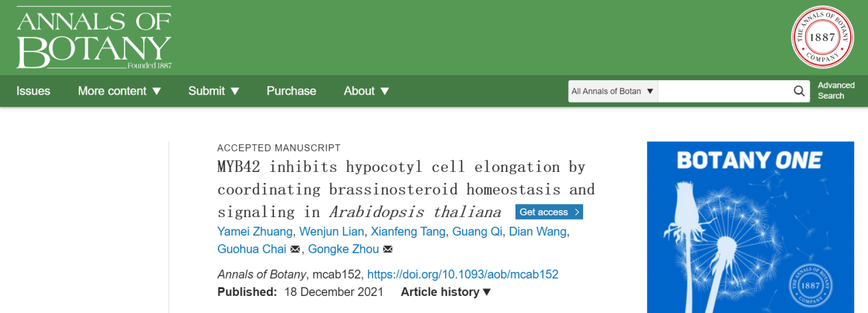 文章链接:MYB42 inhibits hypocotyl cell elongation by coordinating brassinosteroid homeostasis and signaling in Arabidopsis thaliana(https://doi.org/10.1093/aob/mcab152)