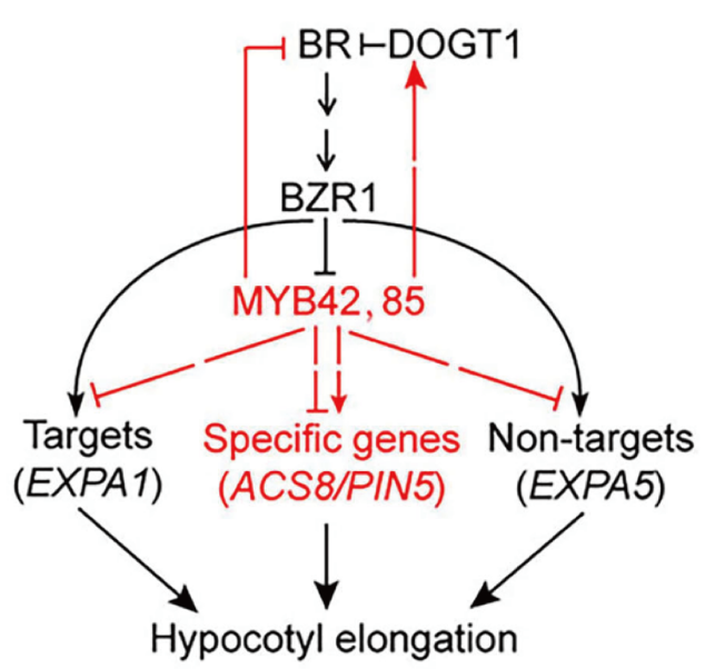 该研究表明拟南芥MYB42和MYB85通过介导BR冗余负调控细胞伸长。MYB42是BR信号途径的关键组分,突变MYB42和MYB85加剧BR受体突变体bri1-5的矮化表型,增加了bzr1-1D(BZR1的功能获得性突变体)下胚轴长度。与之相对应的是,转录组数据显示MYB42抑制多个BZR1下游细胞伸长相关靶基因表达。有意思的是,MYB42也反馈抑制BR积累、激活BR失活酶DOGT1/UGT73C5表达,扩大其在BR信号传导中的作用。我们的结果为作物抗倒伏育种及提高木材产量提供了理论指导。