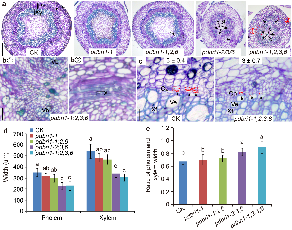 进一步观察发现,在pdbri1-1;2;3;6突变体中,杨树茎形成层起始和木质部分化受到显著抑制(图2)。pdbri1-1;2;3;6 植株茎形成层呈不连续分布,不能像对照一样形成环状结构,而且在皮层薄壁组织异位产生形成层。