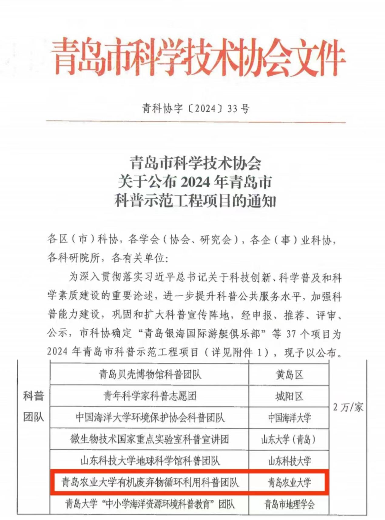 近日,青岛市科学技术协会发布了《青岛市科学技术协会关于公布2024年青岛市科普示范工程项目的通知》(青科协字〔2024〕33号),公布了2024年青岛市科普示范工程项目立项审批结果。由伟德BV官网张小梅副教授主持申报的《伟德BV官网有机废弃物循环利用科普团队》项目成功获批立项,该项目也是公司唯一一支获批立项团队,为公司科普教育注入了新的活力。