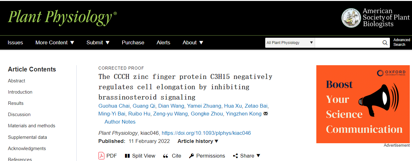 文章链接:The CCCH zinc finger protein C3H15 negatively regulates cell elongation by inhibiting brassinosteroid signaling(https://doi.org/10.1093/plphys/kiac046)