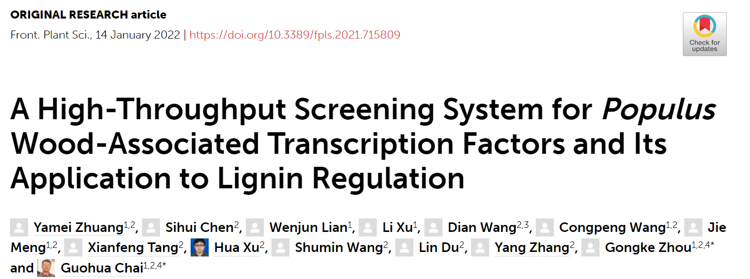 近日,伟德BV官网周功克创新课题组在Frontiers in Plant Science(中科院2区,IF:5.4)上在线发表了“A High-Throughput Screening System for Populus Wood-Associated Transcription Factors and Its Application to Lignin Regulation”的研究论文。