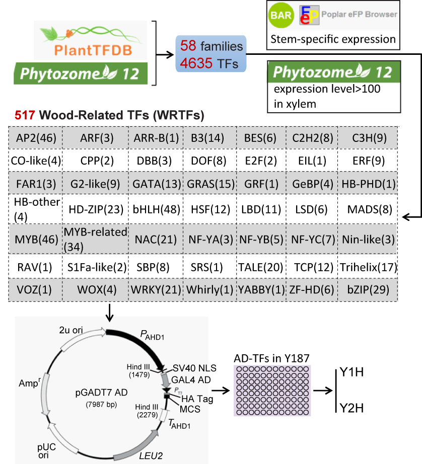 该研究开发了一个高通量筛选系统,包含517个木材相关转录因子(TFs),可用于酵母单杂交(Y1H)和双杂交(Y2H)方法筛选上游调控因子和互作蛋白。基于该系统,我们鉴定了木质素生物合成的多个调控模块。五个TFs与木质素生物合成途径中第一个限速酶基因苯丙氨酸解氨酶2(PAL2)的500 bp启动子片段相互作用,十个TFs与木质素生物合成的关键调节因子PaMYB4/LTF1相互作用。EMSA和BiFC分析进一步验证了部分相互作用。该研究证实此筛选系统是木材形成相关基因筛选和功能分析的有效资源。我们的结果为揭示木材形成的分子机制提供了新的高效工具,为林木分子育种提供理论基础。