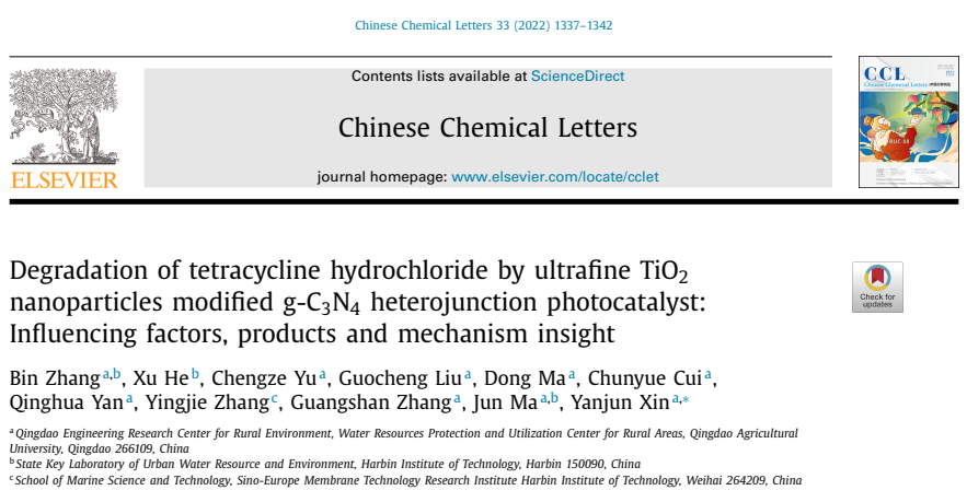 近日,伟德BV官网辛言君教授带领的农村水资源保护与利用课题组的又一篇论文《Degradation of tetracycline hydrochloride by ultrafine TiO2 nanoparticles modified g-C3N4 heterojunction photocatalyst: Influencing factors, products and mechanism insight》入选全球“Chemistry”学术领域ESI高被引论文(Top1% highly cited papers)。该论文于2022年3月发表于《Chinese Chemical Letters》(中科院大类一区Top期刊,影响因子8.455)期刊上。根据ESI最新数据显示,截止于2023年5月,该论文被引次数已达19次。公司研究生张彬为该论文的第一作者,辛言君教授为通讯作者,公司为唯一通讯单位。