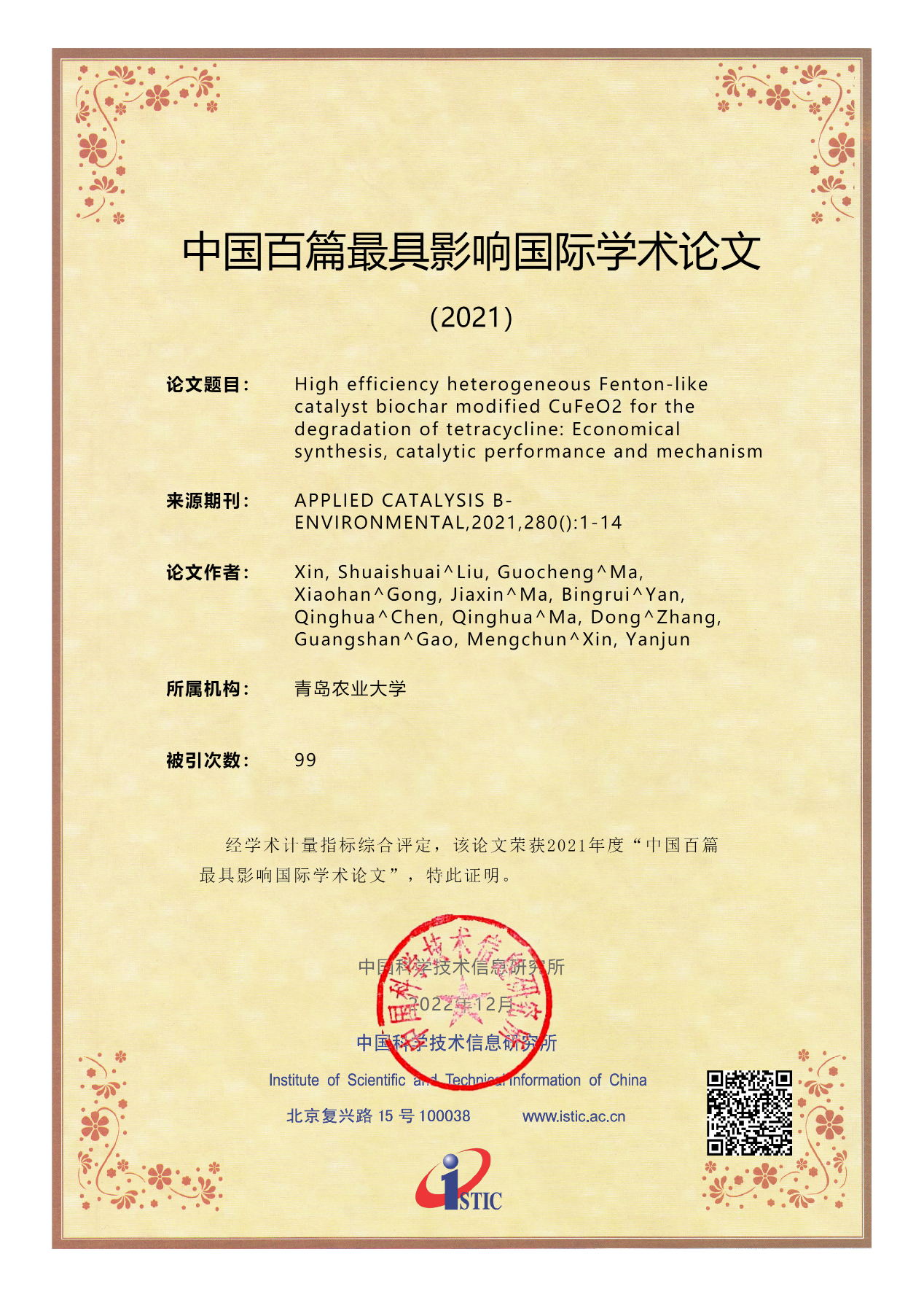 2022年12月29日,“中国百篇最具影响国际学术论文”发布,伟德BV官网青年教师信帅帅(第一作者)和辛言君教授(通讯作者)合作发表的《High efficiency heterogeneous Fenton-like catalyst biochar modified CuFeO2 for the degradation of tetracycline: Economical synthesis, catalytic performance and mechanism》入选“2021年度中国百篇最具影响国际学术论文”,我国农业院校仅有3篇论文入选。该论文2021年发表于环境领域顶级期刊《Applied Catalysis B:Environmental》(IF=24.319),为ESI高被引论文,目前总被引用次数175次。