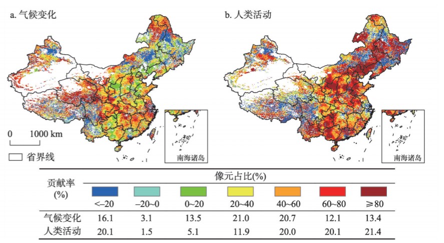 图1 1982—2015年气候变化和人类活动对中国植被绿度变化的贡献率空间分布
