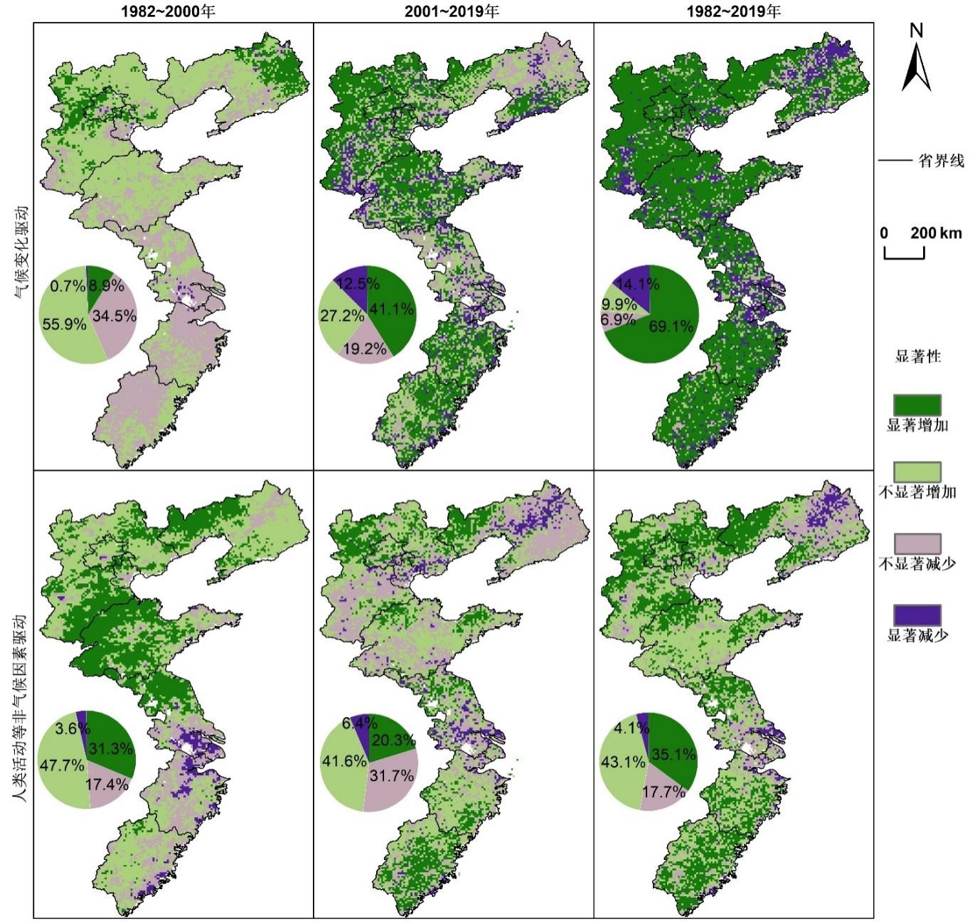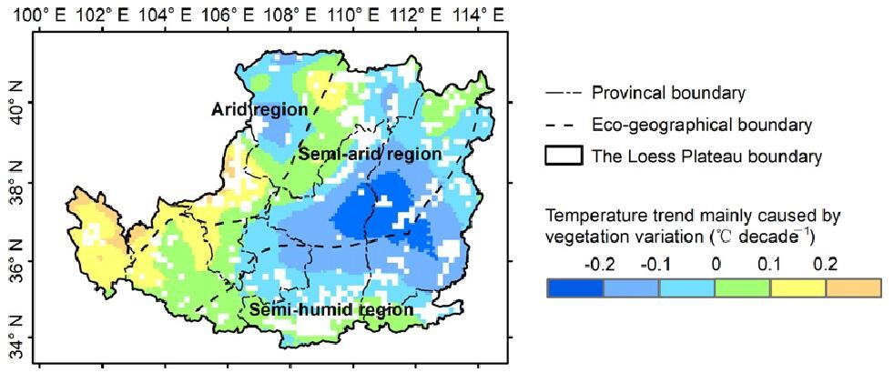 研究表明,①1980s以来,中国大部分地区呈绿化趋势,但不同时期和季节的绿化趋势存在很大差异;②气温上升,特别是春节气温的升高,是近40年来中国植被绿化的主要气候驱动因素,而植树造林、城市化发展和农业现代化措施等人类活动的影响不容忽视;③人类活动对近40年来中国植被绿化趋势的贡献超过气候变化的贡献,人类活动和人类活动分别主导了东部沿海地区前20年和后20年的植被绿化;④黄土高原地区植被恢复已产生降温作用,这一现象在半湿润地区尤为明显,表明植被恢复可在一定程度上减缓气候变暖影响。