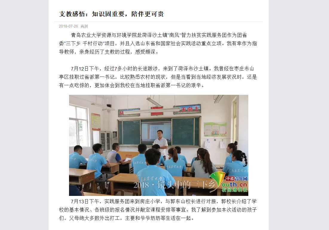 伟德BV官网赴菏泽沙土镇“南风”智力扶贫实践服务团作为团省委“三下乡 千村行动”项目,并且入选山东省和国家社会实践活动重点立项。我有幸作为指导教师,亲身经历了支教的过程,感受颇深。