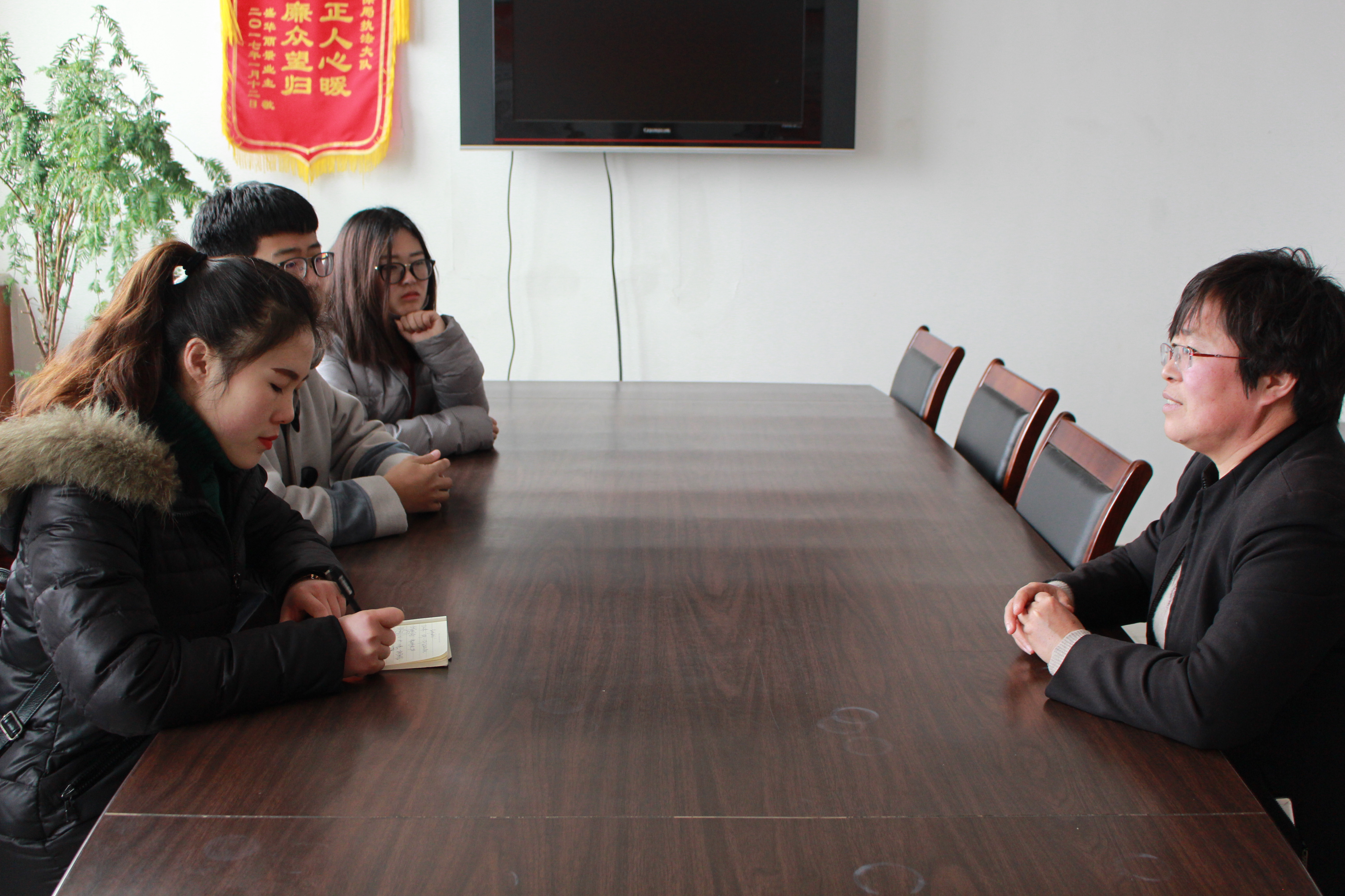 在海阳市环保局,宣传科科长孙女士于会议室热情地接待了实践队员,并向队员们介绍了海阳市生态文明建设的一些基本情况,受益匪浅。队员们也就一些海阳市现存水及土壤问题与孙科长作了交流,并表示资环公司大力支持此类社会实践活动,希望能利用专业优势为海阳市的生态文明建设贡献一份力量。