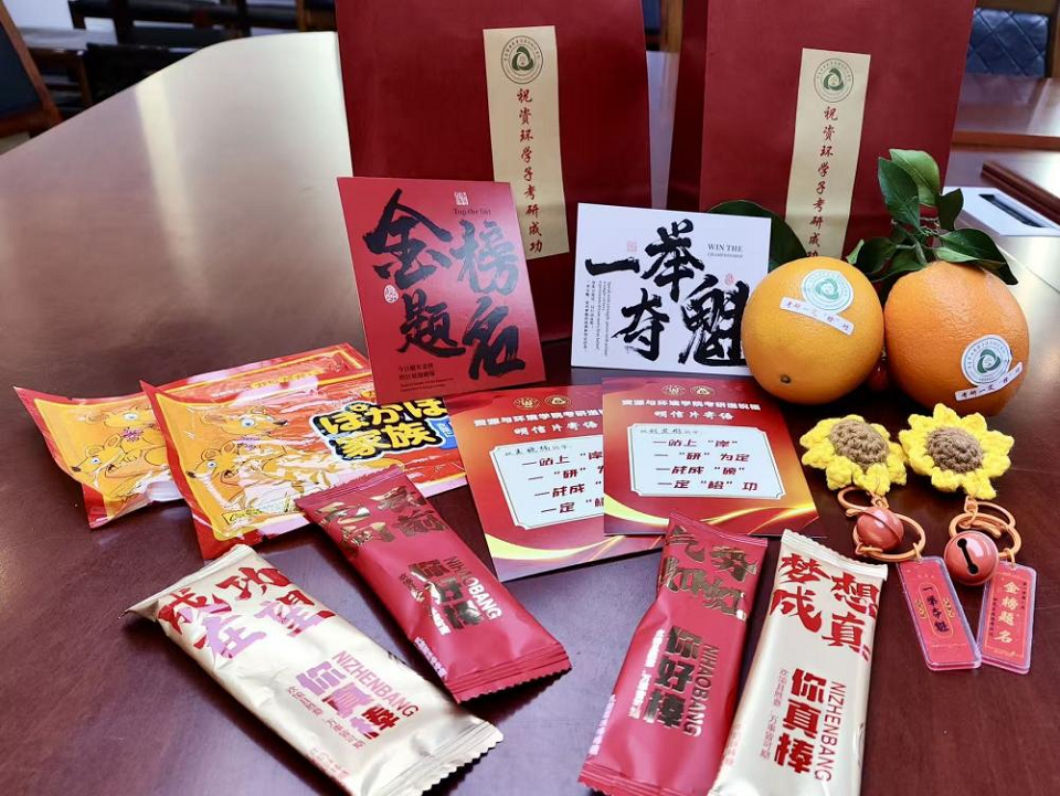 最后,老师们为员工送上了公司精心准备的考研加油包,其中包含橙子、向日葵挂饰、定制明信片、暖贴等,寓意着考研学子一定“橙”功、一举夺“葵”,每一份物品都饱含着公司对考研学子的深切关怀与美好期许。公司老师及各专业的学弟学妹们也以视频的形式送来祝福,为他们加油鼓劲,祝愿他们在考研征程中奋勇向前,成功上岸。