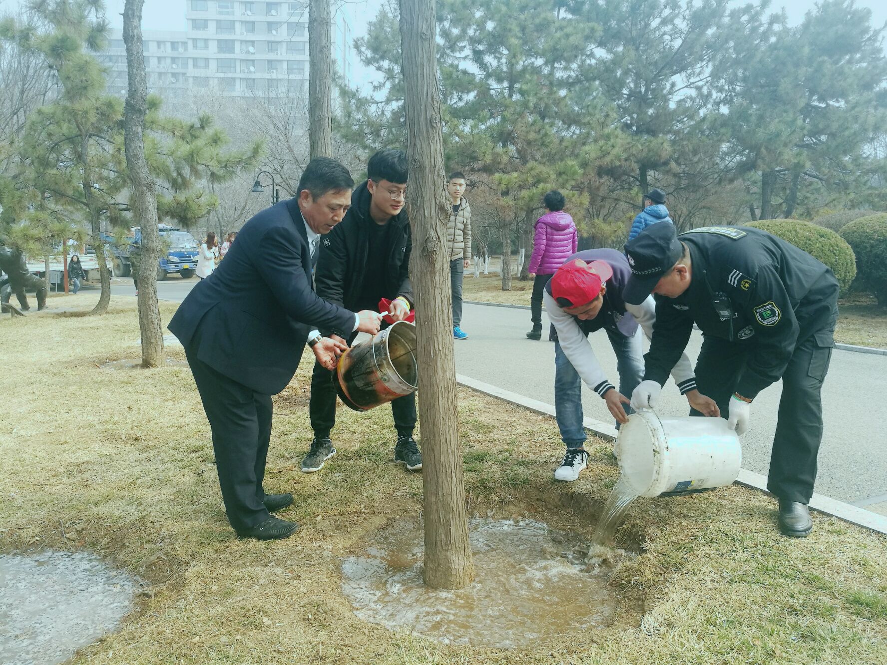 此次志愿活动在城阳世纪公园进行。同学们在园区工作人员的帮助下,很快熟悉了公园环境,并结合公园情况进行合理分配,明确区域,责任到人,保质保量的完成了义务绿化工作。园区工作人员和志愿者一起为公园内的树木做了浇灌,并合照留念。