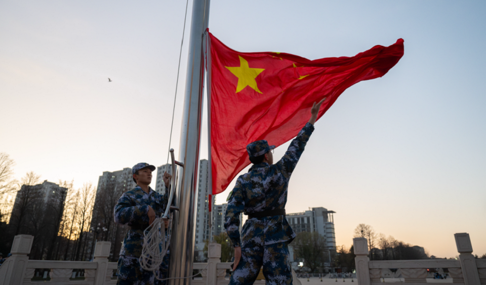 晨光熹微中,国旗护卫队队员昂首挺胸,迈着整齐划一的铿锵步伐护送五星红旗入场。雄壮的国歌奏响,鲜艳的五星红旗冉冉升起,全体师生肃立行注目礼,深切表达对祖国的崇高敬意与热爱。