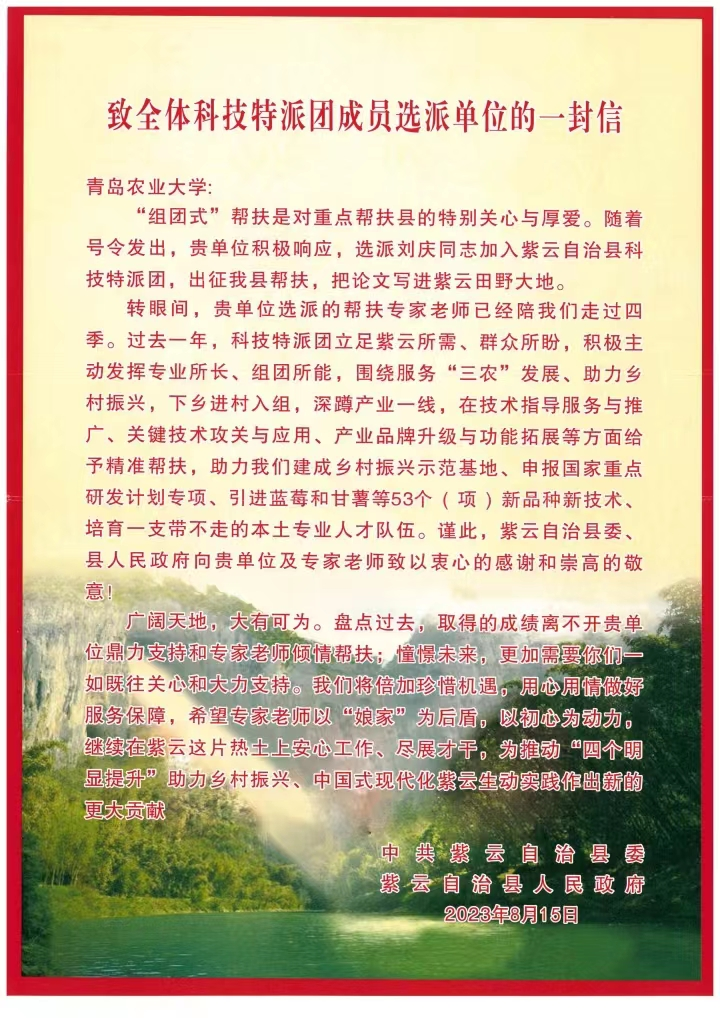 感谢信表示,作为“组团式”帮扶的后盾单位,伟德BV官网主动肩负起助力乡村振兴的社会责任,选派刘庆老师加入紫云自治县科技特派团出征帮扶。在过去一年里,以刘庆老师为代表的科技特派团立足紫云所需、群众所盼,积极主动发挥专业所长、组团所能,围绕服务“三农”发展、助力乡村振兴,下乡进村入组,深蹲产业一线,在技术指导服务与推广、关键技术攻关与应用、产业品牌升级与功能拓展等方面给予精准帮扶。在特派团的助力下,紫云自治县现已建成乡村振兴示范基地、申报国家重点研发计划专项、引进蓝莓和甘薯等53个(项)新品种新技术,培育了一支带不走的本土专业人才队伍。
