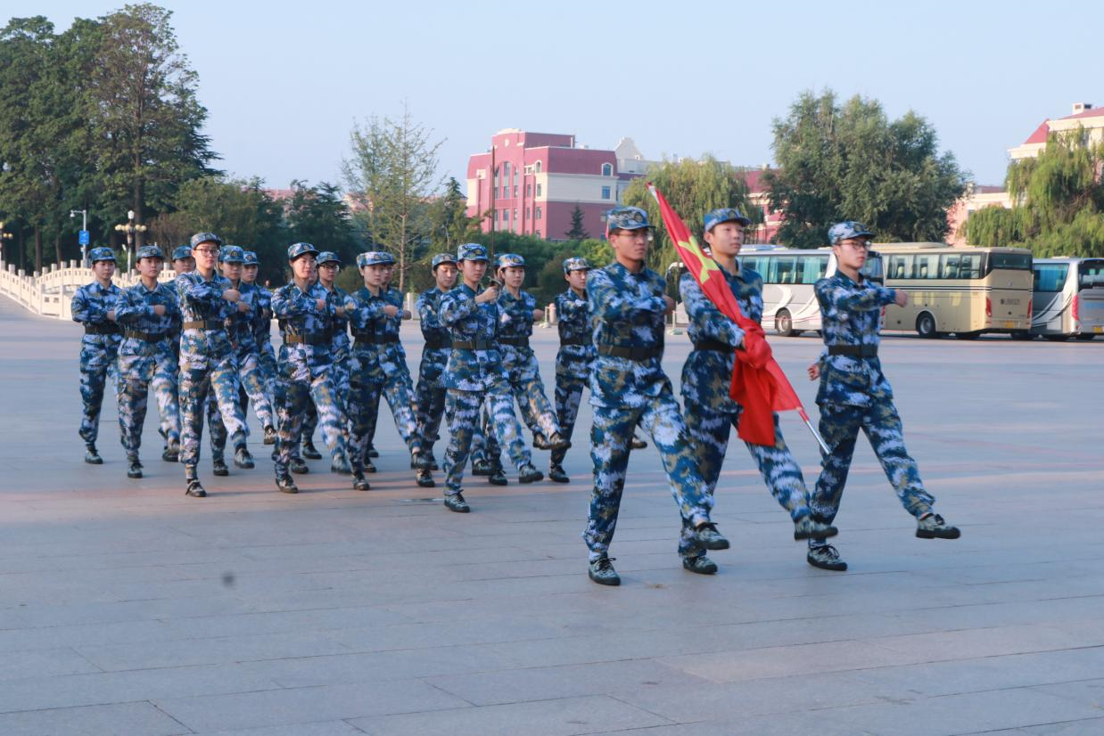 迎着九月初升的朝阳,国旗护卫队队员迈着整齐有力的步伐,护卫着五星红旗走向升旗台。在雄壮豪迈的国歌声中,擎旗手将国旗抛向空中,鲜艳的五星红旗冉冉升起。全体师生肃然而立,共唱国歌,向缓缓升起的国旗行注目礼,送上对祖国最深切的祝福。