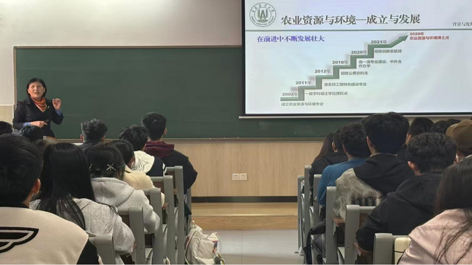 农业资源与环境系主任张士荣从专业背景与发展、专业培养目标与特色、专业就业前景与职业发展三个方面进行了详细介绍。她立足专业分类培养的特色,从专业角度帮助新生明确了本专业在农业领域的重要作用,强调了实践对于新生们的重要意义。张士荣鼓励新生们在未来学有所乐、学有所得、学有所用、学有所思、学有所悟、学有所爱。